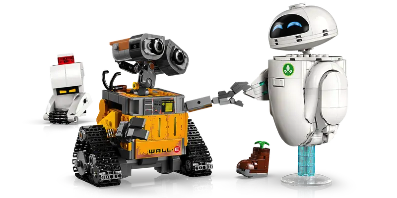 All three robots have movable arms and heads. WALL-E has functional wheels, so he can perform his duties collecting and compacting trash. The openable hatch on his chest has a compartment for a brick-built Garbage Cube. WALL-E’s pet cockroach Hal is built from a handful of bricks and can rest on the robot’s shoulder.