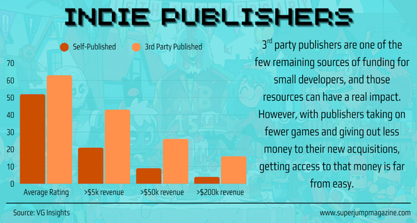 There’s no question that games released through publishers do better on average than those that are self-published. An Over Powered Game Marketing analysis of games released in 2024 showed that third-party published games had a mean revenue twice as high and a median revenue five times higher than games without a publisher. Data from VG Insights backs this up, showing that third-party published games are twice as likely to earn at least $5000 and four times more likely to earn at least $200k.