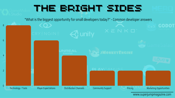 The more time I spend in online developer communities, the more truth I can see here. Without access to the analytical tools and expertise used in the A-tier, small developers instead rely on the behind-the-scenes data of those who’ve gone before them. The same goes for technical advice, which can range from opinions on the best development platform to detailed information on implementing specific features. And if one person has found a useful tool or an amazing bargain, it doesn’t take long until everyone else is in the loop.