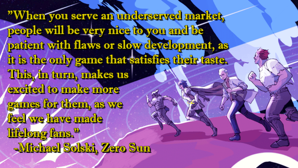 Many developers can achieve the same kind of support from the player base. Among my respondents, few had anything too negative to say about the players, and some had already developed healthy communities around their games.